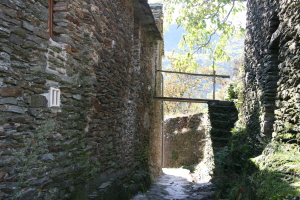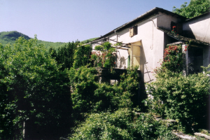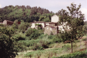 The rear of the house is even harder to photograph. The picture to the left below shows the passage which leads to our front door which is to the left beyond the bridge. The walnut tree provides masses of nuts in the autumn. The (also rather old) picture to the right shows Le Vieux Mas as part of the little hamlet of St Michel de Dèze. Our house is the white one in the centre with the rather larger white old schoolhouse standing behind.
