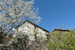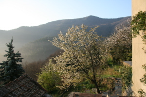 Le Vieux Mas is slightly tricky to photograph because it is on a sloping hillside. So the first picture below (from May 2001 and the one used in Chez Nous), was taken standing on my neighbour's roof. The second is from Easter 2008 and shows our lovely wild cherry, the railings to the new lower terrace and, to the right, behind the quince tree, the clède, originally used for drying chestnuts and now a toolshed and store.