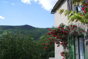 But one of the best features of Le Vieux Mas is its wonderful ever-changing views. A small sample follows. First, the view towards the hill above us on a misty early morning in late April, followed by nearly the same view about a month later with the climbing roses at their best.