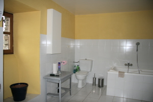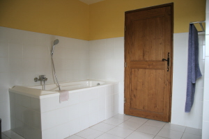 The upstairs bathroom is a light and airy room, with lots of space and a bath as well as a shower.