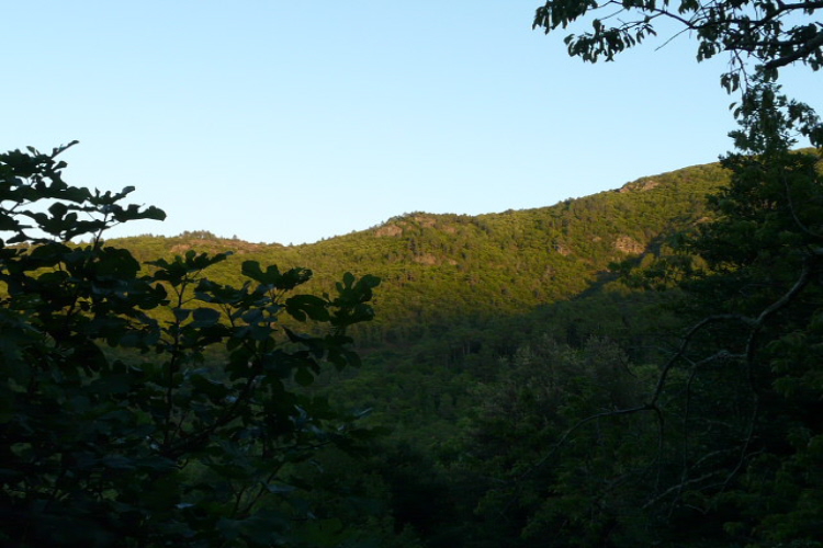 But one of the best features of Le Vieux Mas is its wonderful ever-changing views. A small sample follows. First, the view towards the hill above us on a misty early morning in late April, followed by nearly the same view about a month later with the climbing roses at their best.